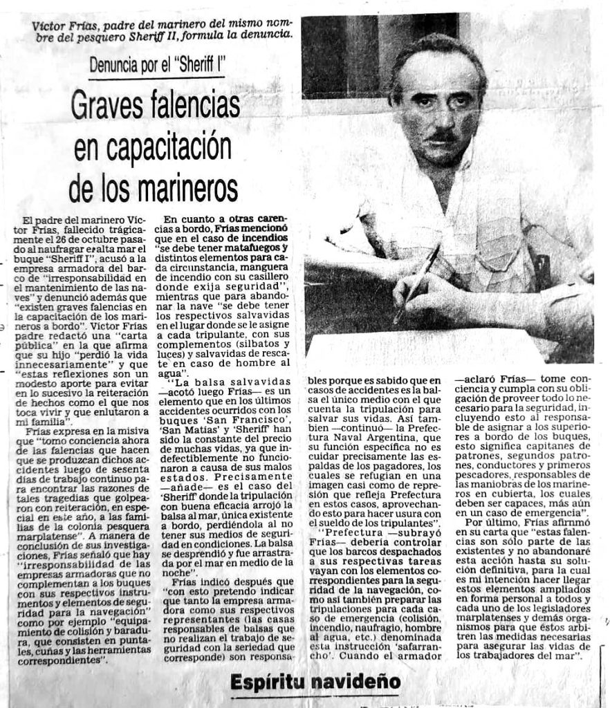 El padre del marinero Víctor Frías, fallecido trágicamente el 26 de octubre pasado al naufragar en altamar el buque «Sheriff I», acusó a la empresa armadora del barco de «irresponsabilidad en el mantenimiento de las naves» y denunció además que «existen graves falencias en la capacitación de los marineros a bordo». Víctor Frías padre, redactó una «carta pública» en la que afirma que su hijo «perdió la vida innecesariamente» y que «estas reflexiones son, un modesto aporte para evitar en lo sucesivo la reiteración de hechos como el que nos toca vivir y que enlutaron a mi familia».