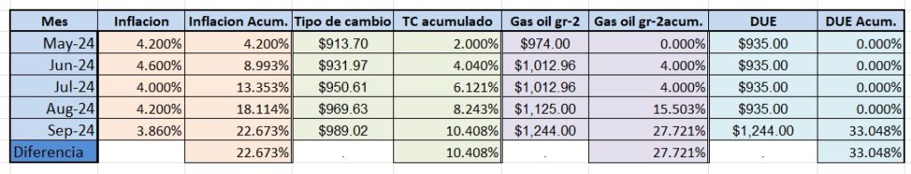 Habiendo pasado de $935 fijado al mes de abril pasado, a los actuales $1244 y teniendo en cuenta inflación y Tipo de Cambio, valor de combustible gas oil grado 2; los datos resultan aún más desalentadores para el sector pesquero, por cuanto el combustible picó en punta comparado a las otras variables, como se ven el en siguiente cuadro: