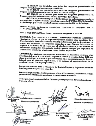 El Sindicato de Obreros Marítimos Unidos (SOMU), representado por su secretario general Raúl Durdos, sus secretarios adjuntos y el área de pesca encabezada por Ángel Juan Navarro, suscribió un nuevo acuerdo paritario con las cámaras CAPIP, CAPeCA, CEPA y CAPA, que nuclea a las empresas de la flota congeladora.