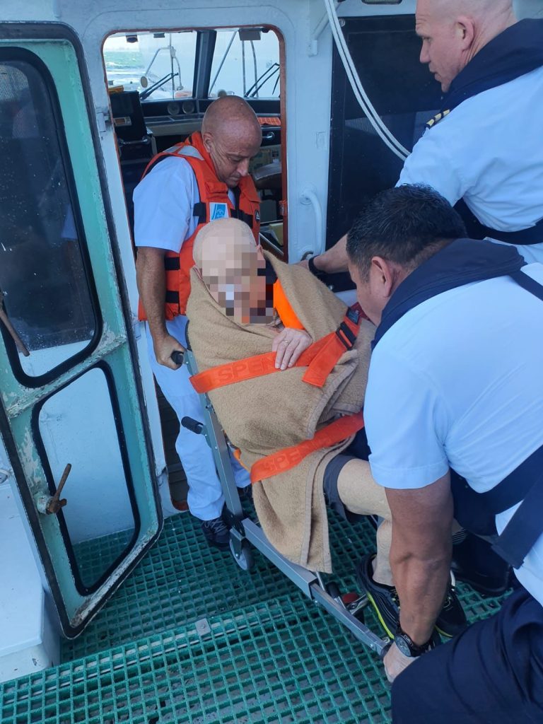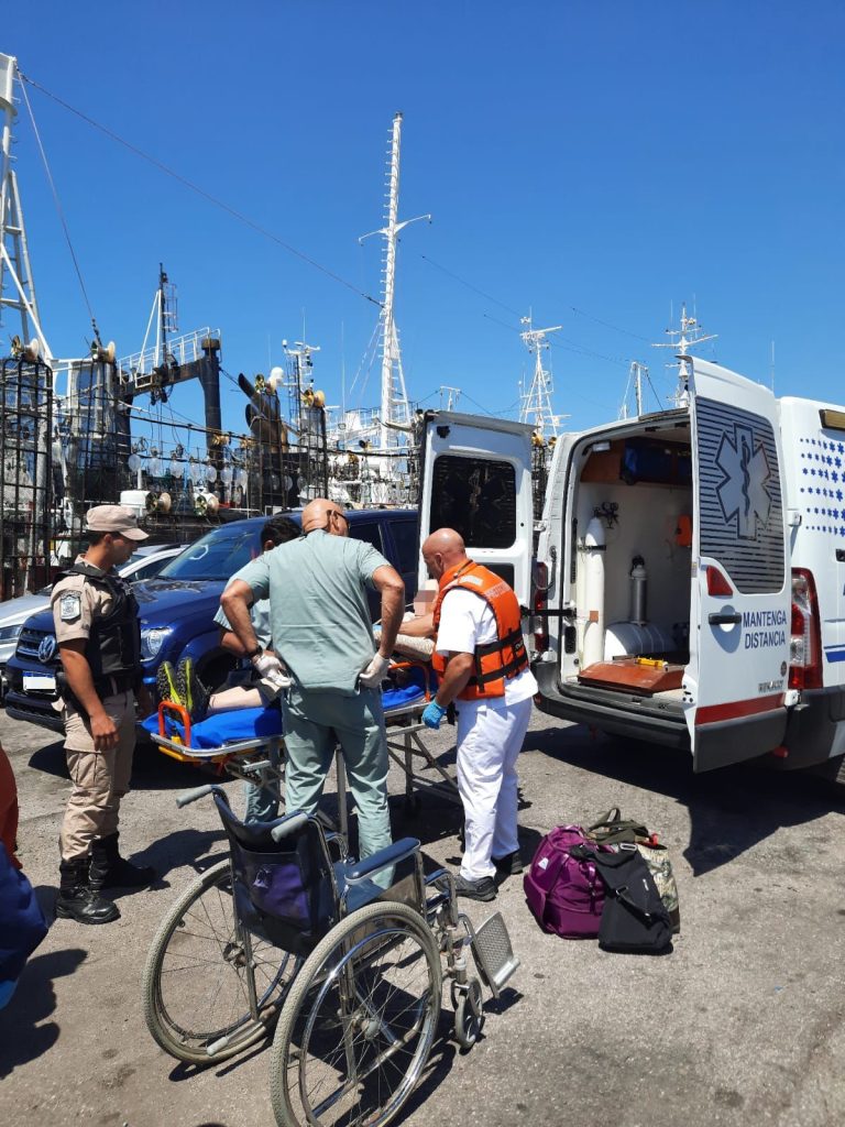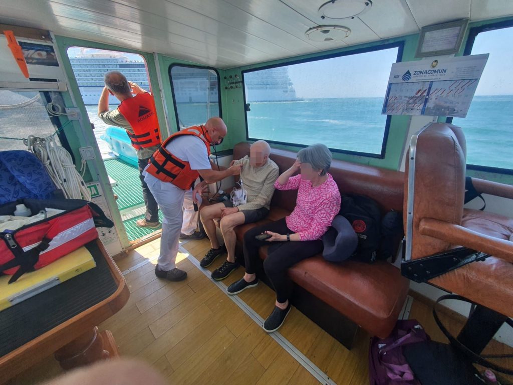 Una vez que el crucero arribó a la rada local, personal de la Estación de Salvamento, Incendio y Protección Ambiental junto al médico de la Prefectura Naval, a bordo de una lancha, desembarcaron al pasajero y su acompañante.