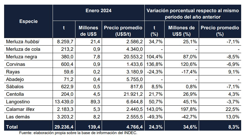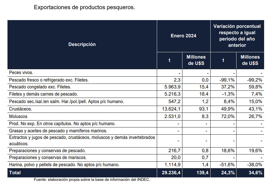 El informe muestra que la Argentina exportó 29.236 toneladas de productos del mar, acumulando un valor de 139,4 millones de dólares, marcando aumentos del 25% y 35% respectivamente en comparación con el mismo período de 2023.