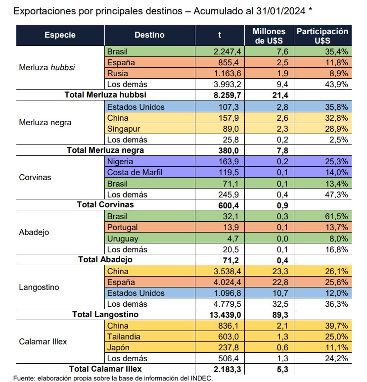 Calamar Illex argentinus: Se destaca como el producto preferencial, por precio, calidad, tamaño y cantidades descargadas en el primer bimestre. El volumen exportado aumentó el 143% con un aumento de precio significativo del 198%, respecto al mismo periodo del año 2023, aunque estas últimas semanas, se nota un mercado más tranquilo. El precio promedio en torno a los 2.440 U$S/Tn. Se exportaron 37.500 toneladas en el bimestre, cuyo principal destino fue China con un 36% de la demanda, que se destaca por encima de Corea del Sur, Singapur, y España. El sudeste asiático conserva el 80% de las compras.