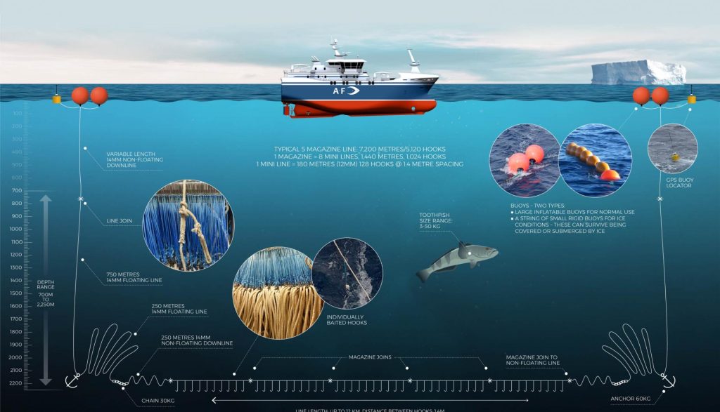 La empresa trabaja en colaboración con ONG y la comunidad científica para desarrollar prácticas de pesca sostenibles y minimizar la captura incidental. Patrocina a estudiantes de doctorado y se asocia con colegas de la industria para investigar y mitigar la depredación de las capturas por orcas y cachalotes. Los sistemas de vigilancia automatizados proporcionan cobertura en vídeo de cada anzuelo calado y recogido, vitales para el cumplimiento y la investigación.