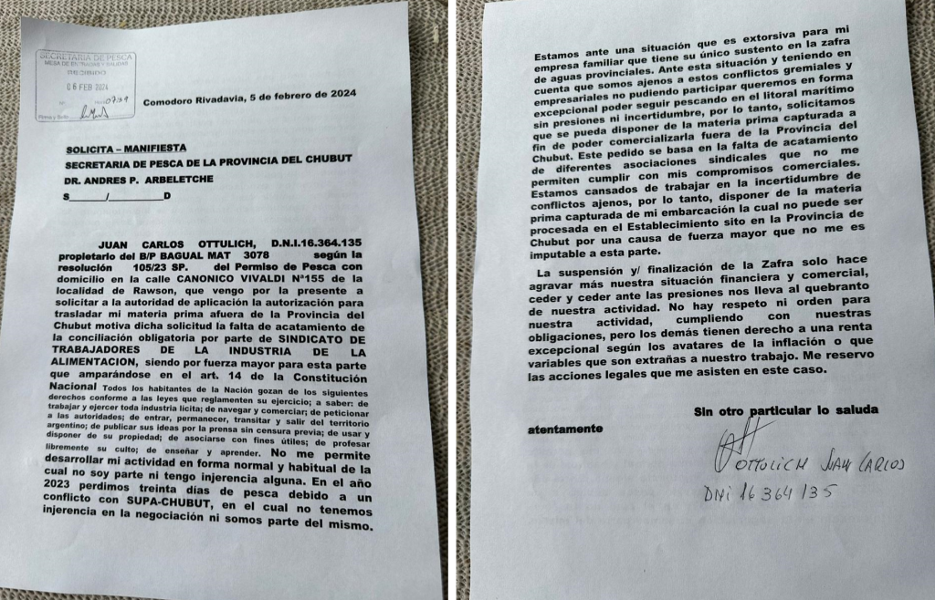 “Estamos ante una situación que es extorsiva para mi empresa familiar que tiene su único sustento en la zafra de aguas provinciales. Ante esta situación y teniendo en cuenta que somos ajenos a estos conflictos gremiales y empresariales no pudiendo participar queremos en forma excepcional poder seguir pescando en el litoral marítimo sin presiones ni incertidumbre, por lo tanto, solicitamos que se pueda disponer de la materia prima capturada a fin de poder comercializarla fuera de la Provincia del Chubut. Este pedido se basa en la falta de acatamiento de diferentes asociaciones sindicales que no me permiten cumplir con mis compromisos comerciales”, continúa el pedido.