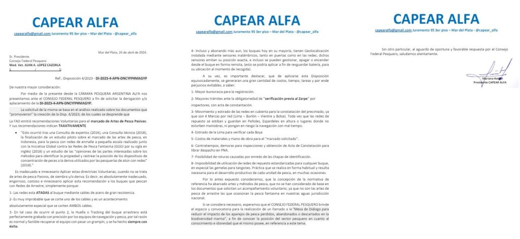 “Si se considera necesario, esperamos que el CONSEJO FEDERAL PESQUERO brinde el espacio y convocatoria para la realización de un llamado a la ‘Mesa de Diálogo para reducir el impacto de los aparejos de pesca perdidos, abandonados o descartados en la biodiversidad marina’, a fin de conocer la posición del sector pesquero en cuanto al conocimiento e idoneidad que el mismo posee, en referencia a este tema”, concluye el envío a López Cazorla y firmado por el Presidente de ALFA, Mariano Retrivi.