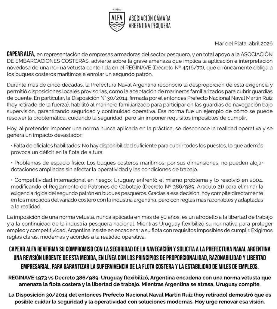 La exigencia de incorporar un segundo patrón en los buques costeros marítimos volvió a tensar la relación entre normativa, regulación y operación en la pesca argentina. En un comunicado de CAPEAR ALFA, en representación de empresas armadoras del sector fresquero, expresó su apoyo a la iniciativa de la Asociación de Embarcaciones Costeras y Fresqueras, y reclamó una revisión urgente del criterio con el que se aplica el Decreto Nro. 4516/73, incorporado al REGINAVE, por su impacto directo sobre la flota costera y fresquera.