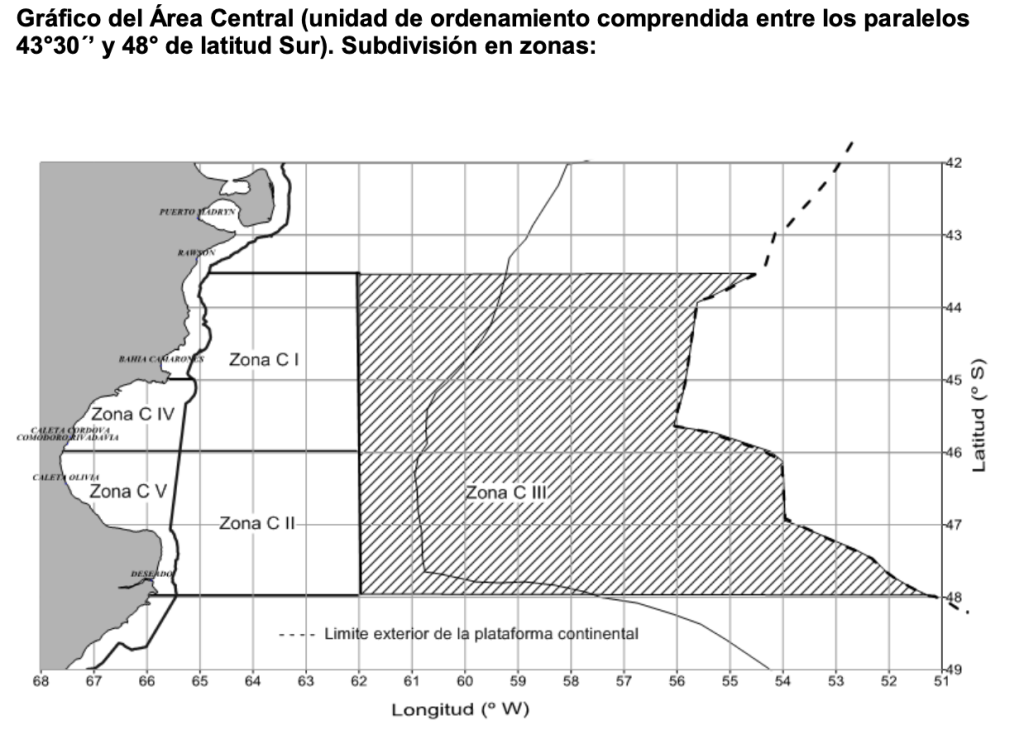 El área de estudio se extiende entre los paralelos 43°45’ y 47°30’ de latitud Sur, desde la costa hasta el meridiano 62° Oeste, incluyendo aguas nacionales y provinciales de Chubut y Santa Cruz dentro del Golfo San Jorge.