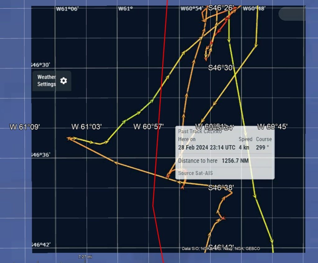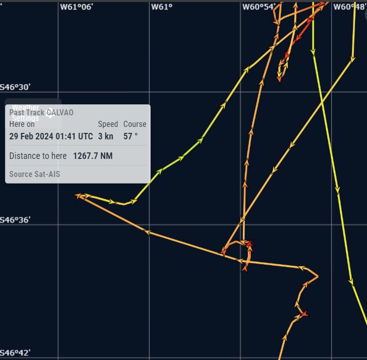 Tras el análisis, se pudo apreciar que el buque redujo su marcha a 6,1 millas náuticas dentro de la Zona Económica Exclusiva Argentina, manteniendo su velocidad por debajo de los seis nudos a 3.1, velocidad que es compatible con tareas de pesca, sin que se hayan registrado condiciones hidrometeorológicas que conllevaren a la necesidad de ponerse a resguardo en la zona. La cinética analizada por nuestro departamento de monitoreo, indica que el BP Calvao, desde las 2036 hs del día 28 de Febrero, hasta las 2350 hs, con rumbo 280º ingresa a una velocidad de 3.1 nudos, lo que aparentemente es velocidad compatible a operaciones de pesca.