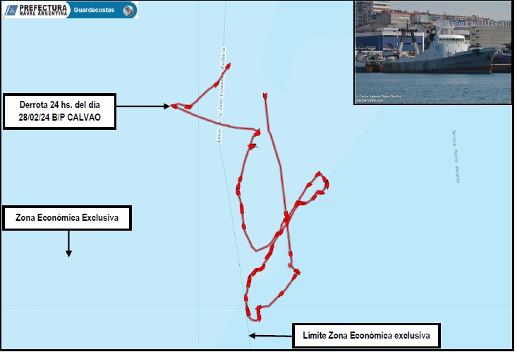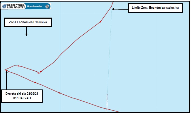 En esta ocasión, personal especializado de la Prefectura Naval Argentina monitoreando desde el comando de operaciones del Centro de Tráfico Marítimo del Edificio Guardacostas a las órdenes del PP José Cristian Abel Vigano, detectó al BP Calvao, el cual navega con bandera de Portugal, el que estaría pescando ilegalmente dentro de la Zona Económica Exclusiva argentina, en una clara infracción a la Ley N° 24.922.