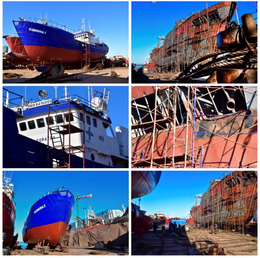Contando el desguace del Mar Azul, al que le quedan aproximadamente 20,25 días más, estamos con cinco barcos arriba. Ya bajamos el Francesca, en las próximas horas sube el María Rita, la semana que viene tenemos un halaje más, tenemos para botar el Cleopatra que es un barco que da asistencia a las plataformas en Bahía Blanca, ese barco era pesquero, fue supply y ahora está de supply nuevamente. Ese barco hace 6 años lo pintamos de azul, porque estaba rojo, no es un barco que navegue tanto, pero le corresponde las generales de la ley y cada tres años tiene que hacer los trabajos necesarios.