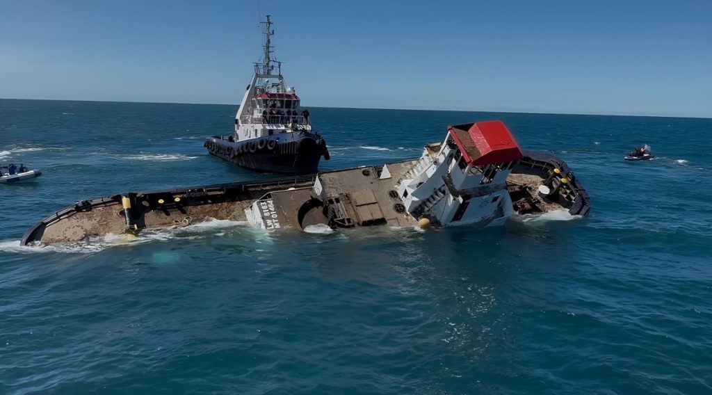 Bajo estrictas normas ambientales y supervisi贸n de la Prefectura Naval Argentina, Remolcadores Mar del Plata realiz贸 un hundimiento controlado del Kyokko R煤a.