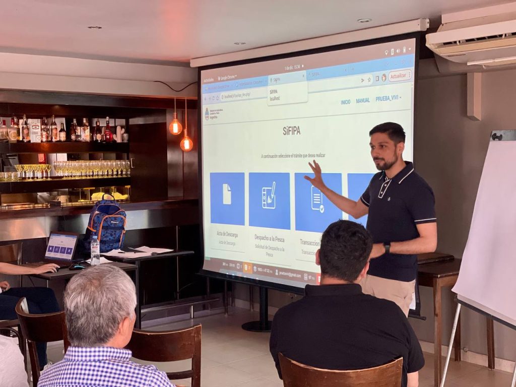 En un nuevo taller de capacitación al personal de empresas pesqueras del Modulo de Transacciones Comerciales, la Dirección Nacional de Pesca impulsa la responsabilidad empresaria y las nuevas normativas vigentes sobre las vicisitudes de esta nueva plataforma, que intenta, entre otras cosas, ser la documentación electrónica inicial para la trazabilidad en el caladero argentino. Se esperan que otros Entes del Estado Nacional se sumen para continuar desde el origen de la captura primaria extractiva, el transporte, procesamiento y exportación hasta el destino final del consumidor.
