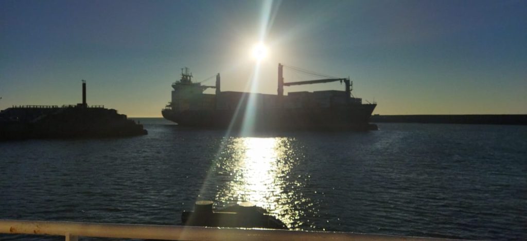 Nueva recalada por el puerto local del Portacontenedores London Trader, después de demoras en Puerto Deseado y con novedades respecto a desafortunados sucesos en la Republica de Ucrania.