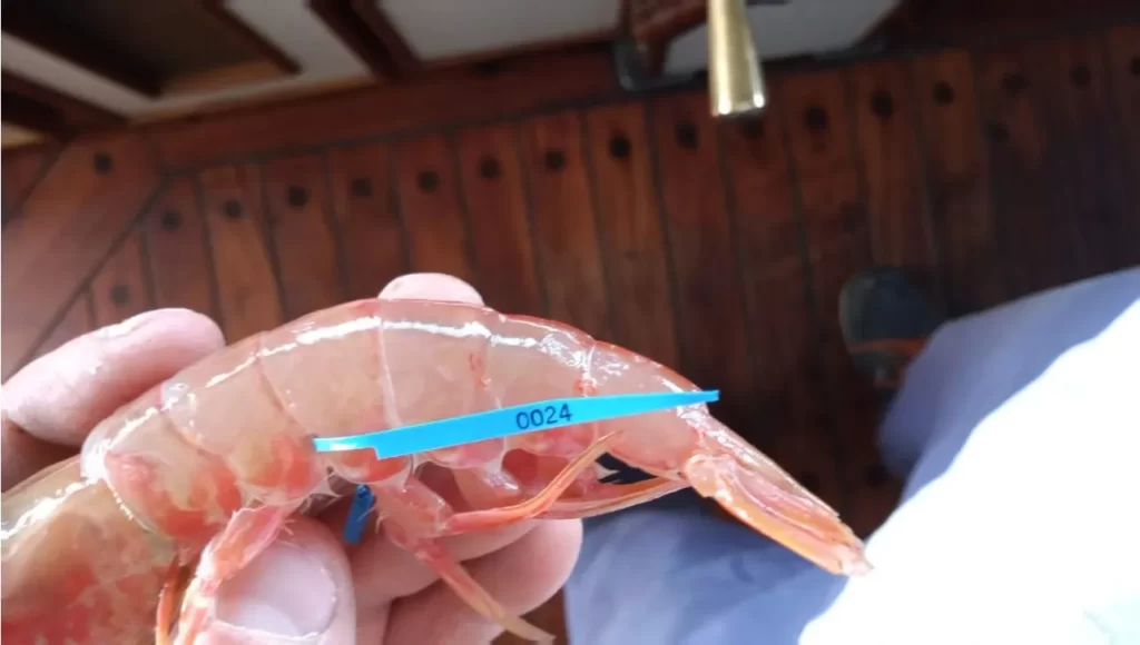 Despues de casi dos meses de la marcacion de langostinos realizada por el BIP Mar Argentino en enero del corriente, fue recapturado el primer ejemplar de langostino con precinto Nro.0024 al Noreste de la posición de marcado.