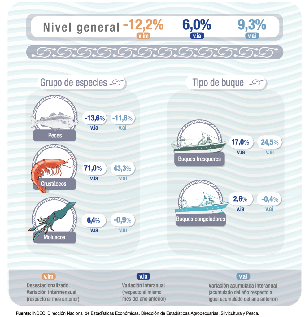 La pesca marÃtima exhibe crecimiento interanual del 6% en marzo, pero evidencia una caÃda mensual interanual del 12,2%, en un contexto de marcada estacionalidad y heterogeneidad sectorial. Se destacaron las capturas de chubut en materia de langostino salvaje y natural y el fuerte aporte de la flota liderada por congeladores poteros dedicados al calamar illex.