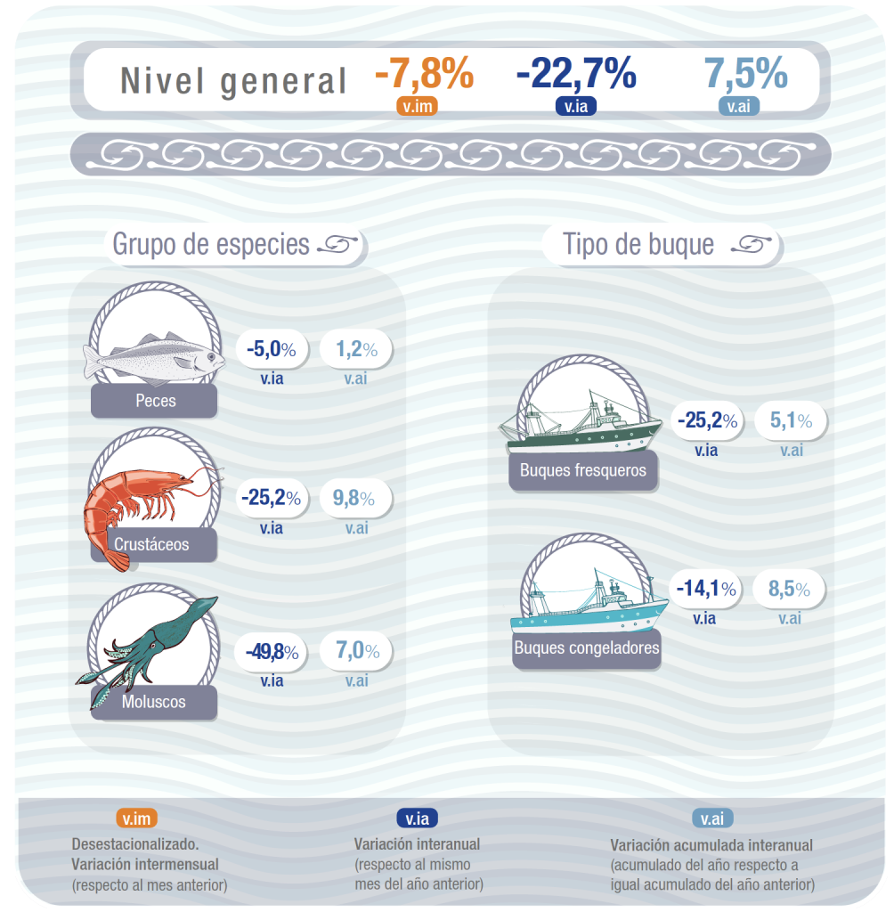 A pesar de la caÃda del 22,7% en diciembre de 2024, la pesca marÃtima cerró el año con un crecimiento del 7,5%, impulsado por los crustáceos y los buques congeladores. Sin embargo, la crisis en la rentabilidad de flotas fresqueras genera incertidumbre para 2025