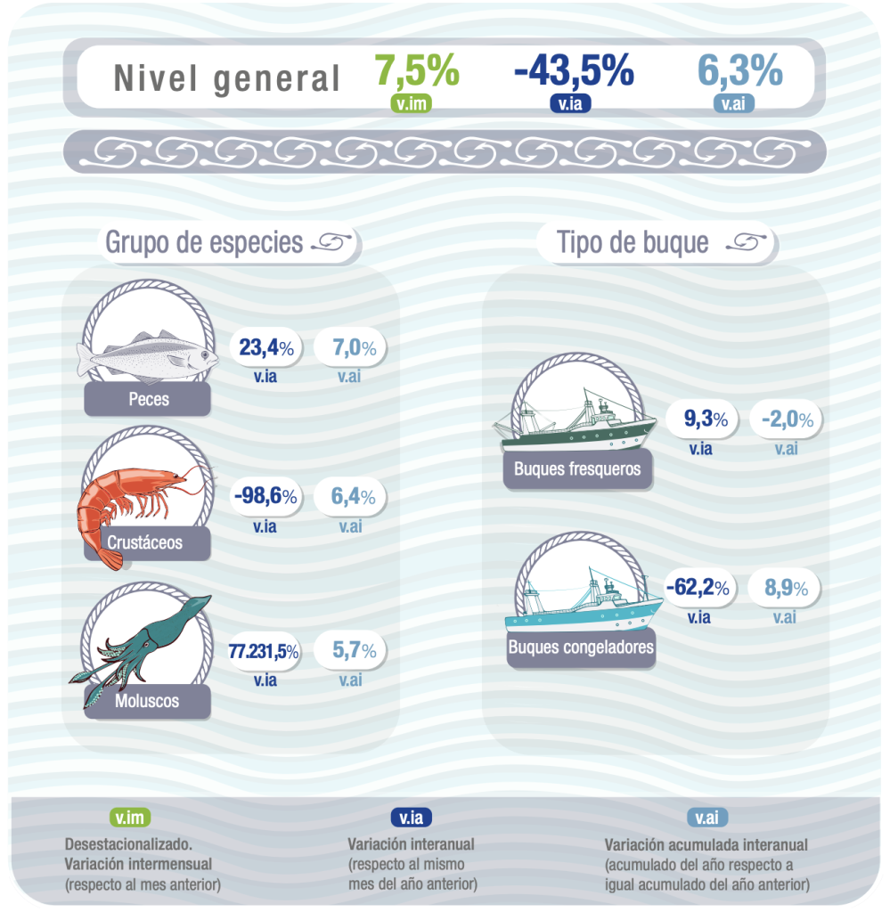 El Ãndice de Producción Industrial Pesquero (IPI Pesquero) revela una disminución preocupante del 43,5% interanual en octubre de 2024. A pesar de un ligero repunte mensual (+7,5%), la tendencia general es sólida. La concentración de las zafras de calamar y langostino destaca como factor clave en el análisis del desempeño del sector.