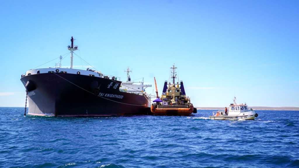 En el mediodía del jueves el buque granelero de bandera liberiana “Tai Knighthood” ya se encontraba nuevamente en navegación. Lo repararon en el Golfo Nuevo, tras el incidente en el puerto de Quequén.