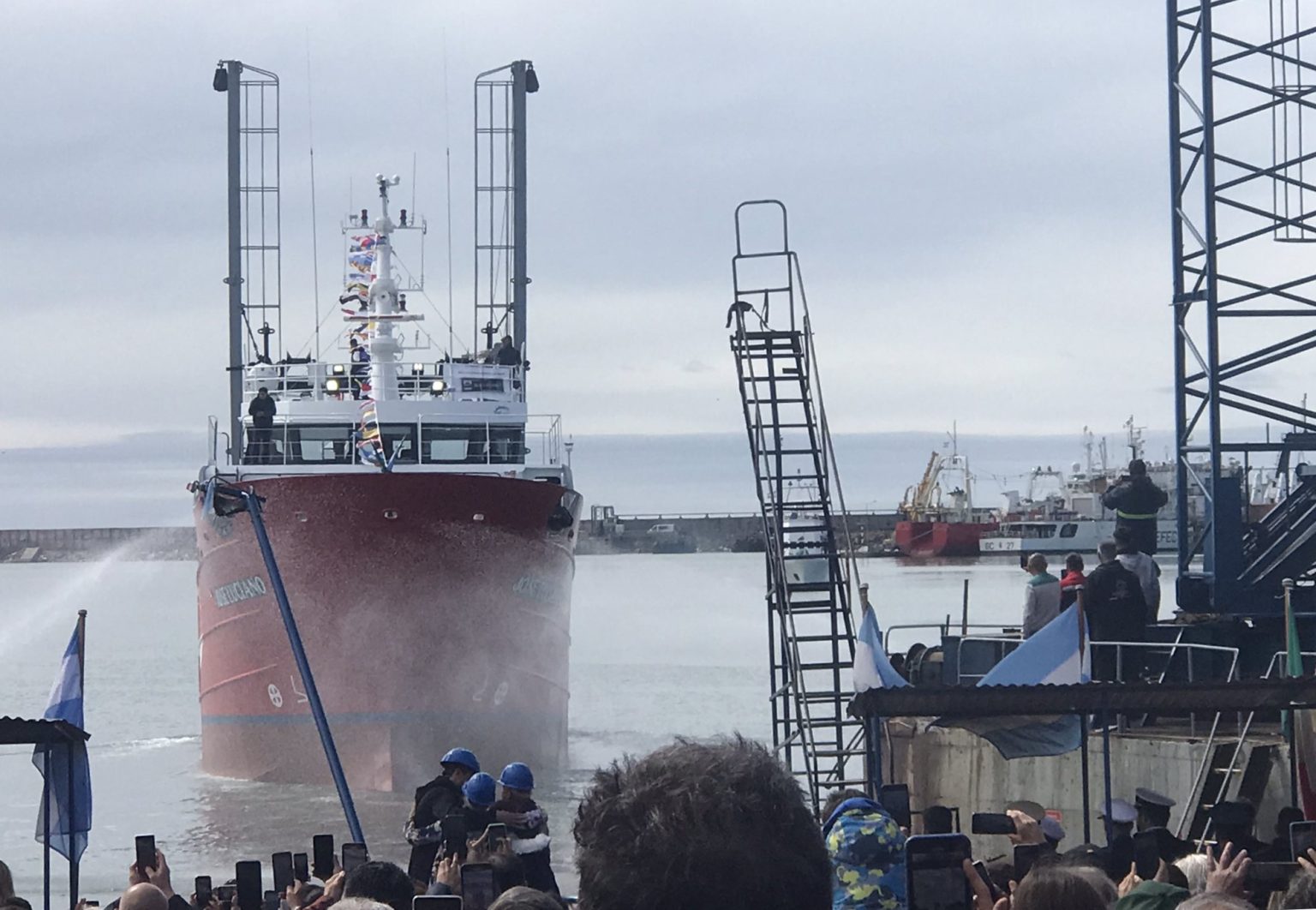 Emoción, júbilo y una cantidad poca veces vista en las gradas del Astillero Naval Federico Contessi y Cia. presenciaron la botadura de un nuevo buque pesquero de refinado e innovador diseño del equipo del Ing. Naval Leandro Goñi.