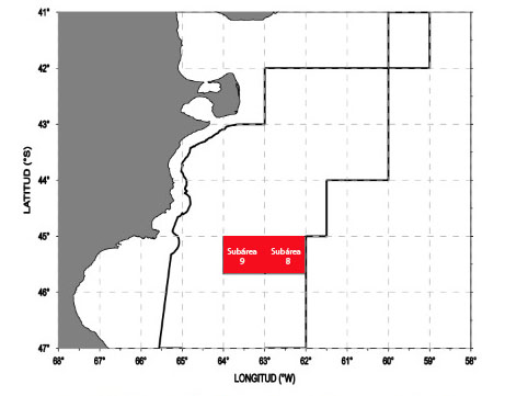• Subárea 9: entre los paralelos 45° y 45°40´ S y los meridianos 63° y 64°´O. Cuatro buques.