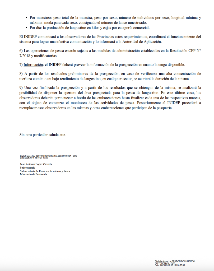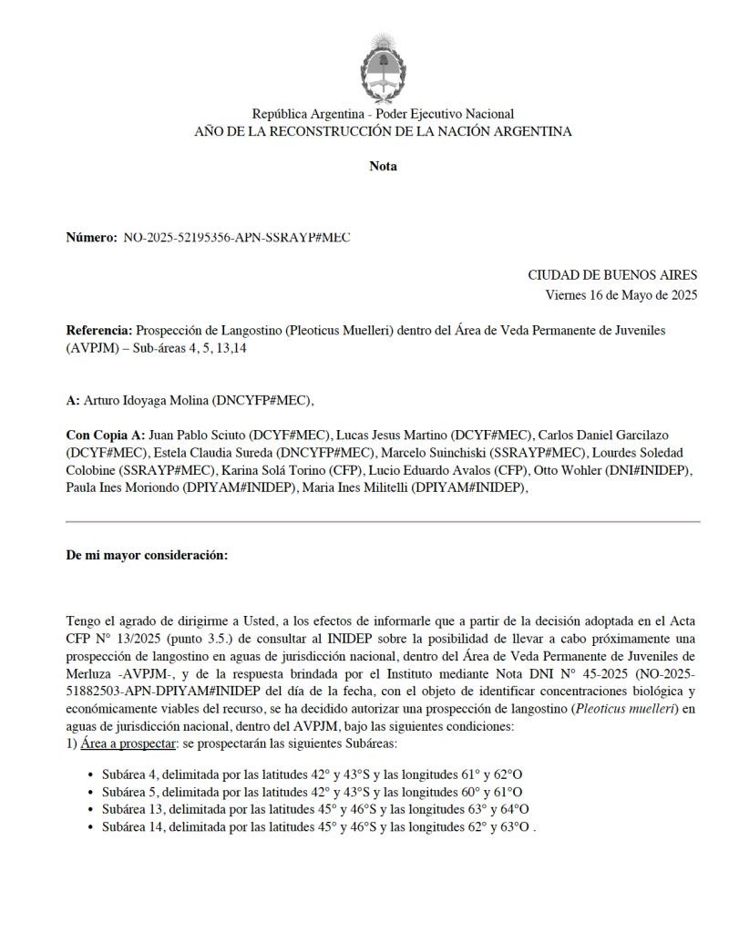 El Consejo Federal Pesquero (CFP) aprobó la realización de una prospección de langostino (Pleoticus muelleri) en aguas de jurisdicción nacional dentro de la Zona de Veda Permanente de Juveniles de Merluza (ZVPJM). La medida se enmarca en lo dispuesto en el punto 3.5 del Acta CFP Nro. 13/2025 y cuenta con el aval técnico del INIDEP, que respondió positivamente a la consulta mediante la Nota DNI Nro. 45-2025, llegada ayer a la tarde al despacho del propio Subsecretario de Recursos Acuáticos y Pesca, Juan Antonio Lopez Cazorla, quien con firma electrónica al pie de la misma, puso en inmediato conocimiento al Director Nacional de Coordinación y Control Pesquero, Dr. Arturo Idoyaga Molina, para la puesta en marcha de los controles que se implementaran en los distintos muelles intervinientes del litoral marÃtimo argentino.