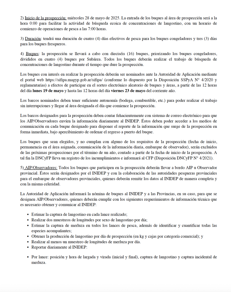 El INIDEP coordinará con las provincias el embarque de AIP/Observadores, quienes deberán estimar las capturas de langostino y merluza por lance, realizar muestreos diarios de longitudes por sexo, y reportar producciones por categorÃa comercial, entre otros parámetros técnicos. Los datos serán fundamentales para evaluar el posible aprovechamiento del recurso.