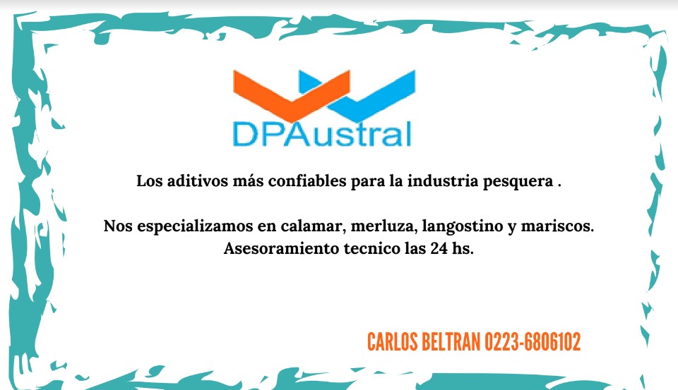 “Tenemos productos como el calamar que no tiene más solución que utilizar aditivos, porque si no lo tenés que tiernizar al tubo. Para dimensionar, un blanqueador de nuestra competencia utiliza unos 30 litros por tonelada, con el nuestro se usan 10. ¿Es más caro? Sí, pero se utiliza la tercera parte, por lo tanto es más barato y con mejores cualidades”, detalla el representante de DPAustral sobre otro de los destacados productos.