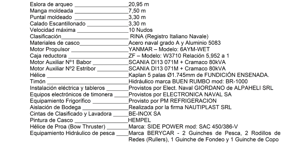 Este nuevo buque responde al prototipo AC-GG y fue dise帽ado con una eslora de arqueo de 20,95 metros, una manga moldeada de 7,50 metros y un puntal de 3,30 metros. Est谩 impulsado por un motor principal Yanmar, capaz de desarrollar una velocidad m谩xima de 10 nudos. Se trata de una embarcaci贸n vers谩til, apta para realizar tareas de arrastre y de media agua, concebida para optimizar el rendimiento de la flota de Rawson y garantizar una manipulaci贸n cuidadosa de las capturas, con el objetivo de elevar la calidad del producto desembarcado.
