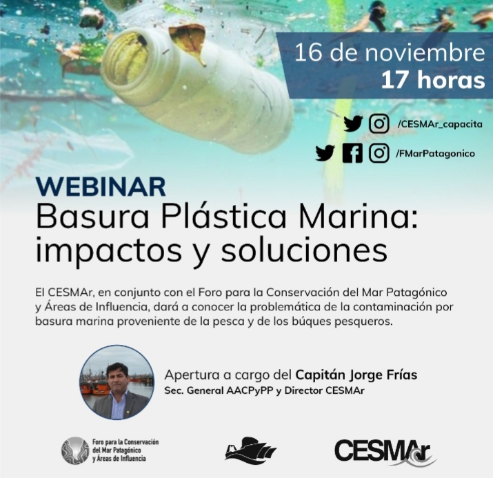 El CESMAr, conjuntamente con el Foro para la Conservación del Mar Patagónico y Áreas de Influencia, ha anunciado para los días venideros el Webinar “Basura Plástica Marina: impactos y soluciones”, sobre la problemática de la contaminación proveniente de la pesca.