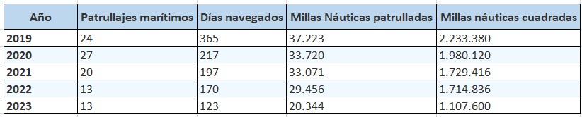 La Prefectura Naval Argentina con sus Unidades de Superficie, en el periodo correspondiente desde el año 2019 al 2023, patrulló los espacios marítimos sujetos a jurisdicción nacional según el siguiente detalle,