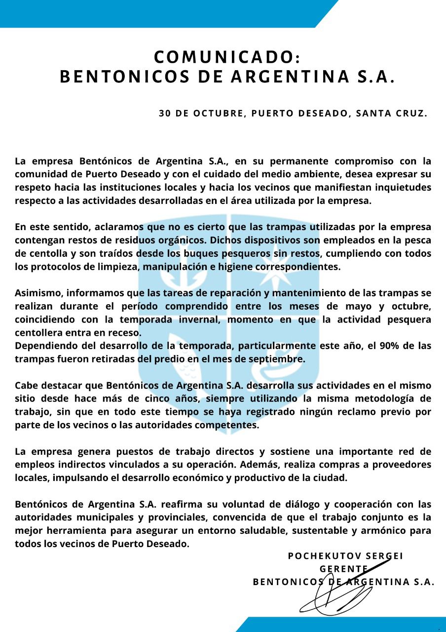 “La empresa desea expresar su respeto hacia las instituciones locales y hacia los vecinos que manifiestan inquietudes respecto a las actividades desarrolladas”, comienza el texto difundido por la firma. En ese marco, Bentónicos de Argentina S.A. aclaró que no es cierto que las trampas utilizadas contengan restos de residuos orgánicos, ya que los dispositivos son empleados para la pesca de centolla y “son traídos desde los buques sin restos, cumpliendo con todos los protocolos de limpieza, manipulación e higiene correspondientes”.