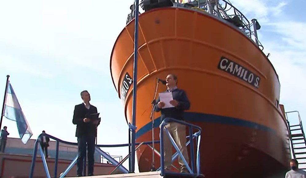 Participaron de la ceremonia la Madrina del Camilo S, Sra. Sonia G. Sosa, quien minutos después de la bendición del cura párroco Juan Pablo Arrechea daba el bautismo con la tradicional botella de champagne sobre la proa del Camilo S., ante la atenta mirada del capitán de la nave, Oscar González, con los deseos de los presentes y de los que siguieron la ceremonias por las redes, de «buena pesca».