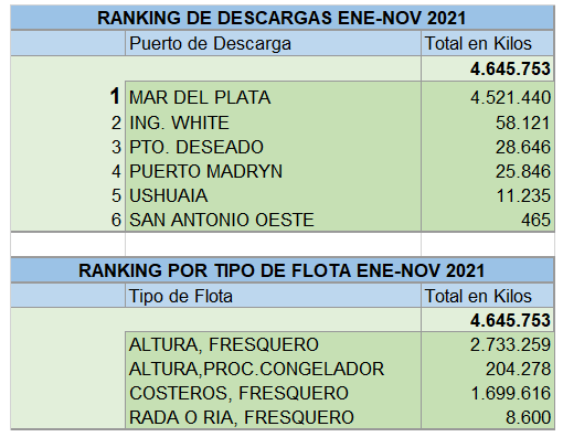 Hoy ingresaron cerca de 280 toneladas, 8000 cajones, una buena suma para redondear descargas cercanas a las 4700 toneladas de este año 2021, de las cuales 4521 pasaron por el muelle de Mar del Plata (96%)