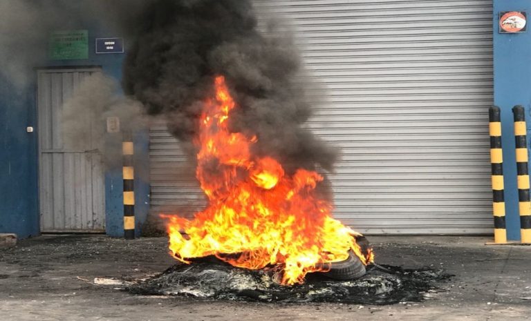 El reclamo de los trabajadores, quienes se instalaron en las puertas del establecimiento, varios de ellos con parte de su familia, incluy贸 la colocaci贸n de cubiertas neum谩ticas, siempre con el riesgo para propios y extra帽os, de que alguien pierda los estribos y las encienda, como sucedi贸.