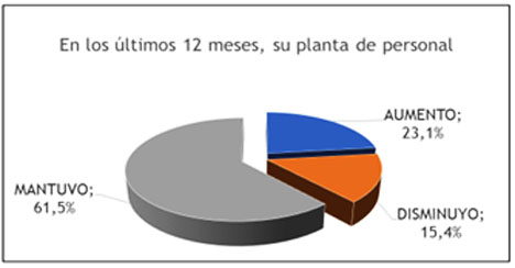 Esta coyuntura impacta en el nivel de empleo y la posibilidad de generar nuevos puestos de trabajo. El 61,5 por ciento de las empresas consultadas señaló que mantuvo su planta de personal; mientras que el 15,4 por ciento la disminuyó.