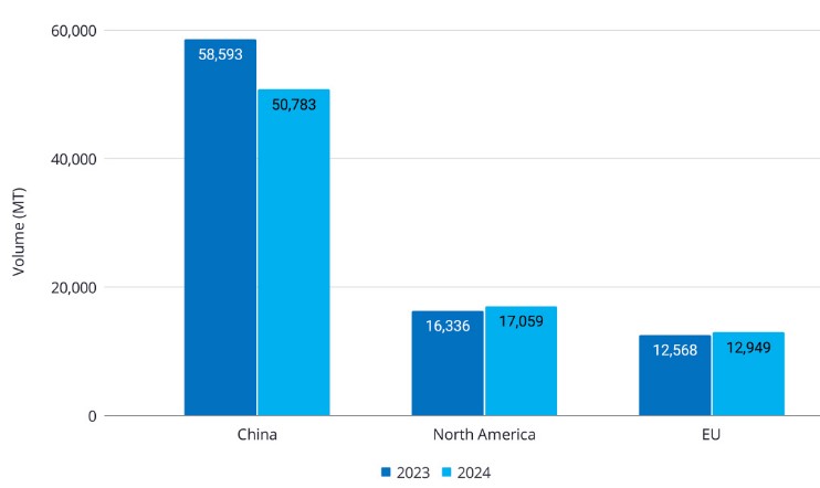 En China, el valor medio por kilogramo en enero de 2024 fue de U$S 4,43, un 16% menos que en enero de 2023 pero un 2% más que en diciembre de 2023. El valor medio por kilogramo en EE.UU. en enero de 2024 fue de U$S 5,77, un 10% menos que en enero de 2023 y un 2% por debajo de diciembre de 2023. En la UE, el valor medio por kilogramo en enero de 2024 fue de U$S 5,66 un 14% menos que en enero de 2023 pero un 3% más que en diciembre de 2023.