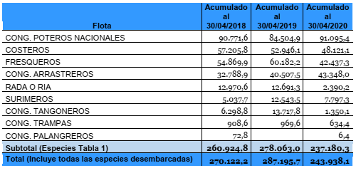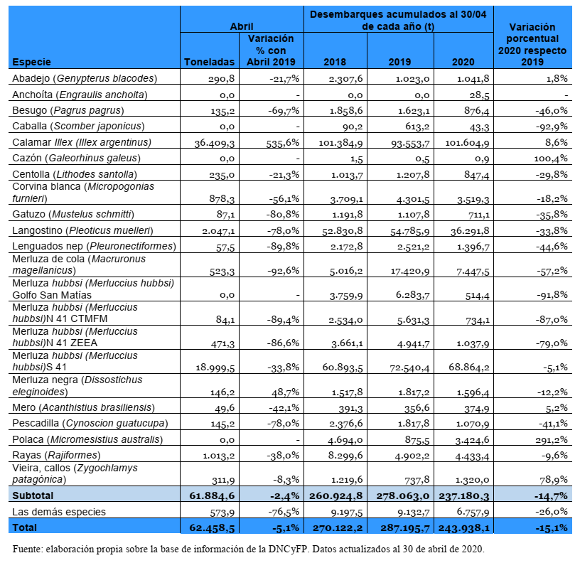 Entre enero y abril de este complejo 2020 se desembarcaron 243.938 toneladas. El volumen refleja una baja del 15,1 por ciento con respecto al mismo cuatrimestre del año pasado. El recorte entre períodos implica 43.257 toneladas menos sobre los muelles.