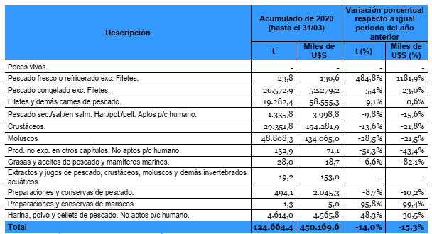 Con el efecto Covid-19 todavía incipiente en la estadìstica, se advierten precios promedio con tendencia a la baja en langostino (-8,9 por ciento), merluza hubbsi (-4,7 por ciento), merluza de cola (-11,3 por ciento) y corvina (-11,9 por ciento), entre otras especies. Sin embargo, mejoran calamar (+6,9 por ciento) y abadejo (+15,4 por ciento).