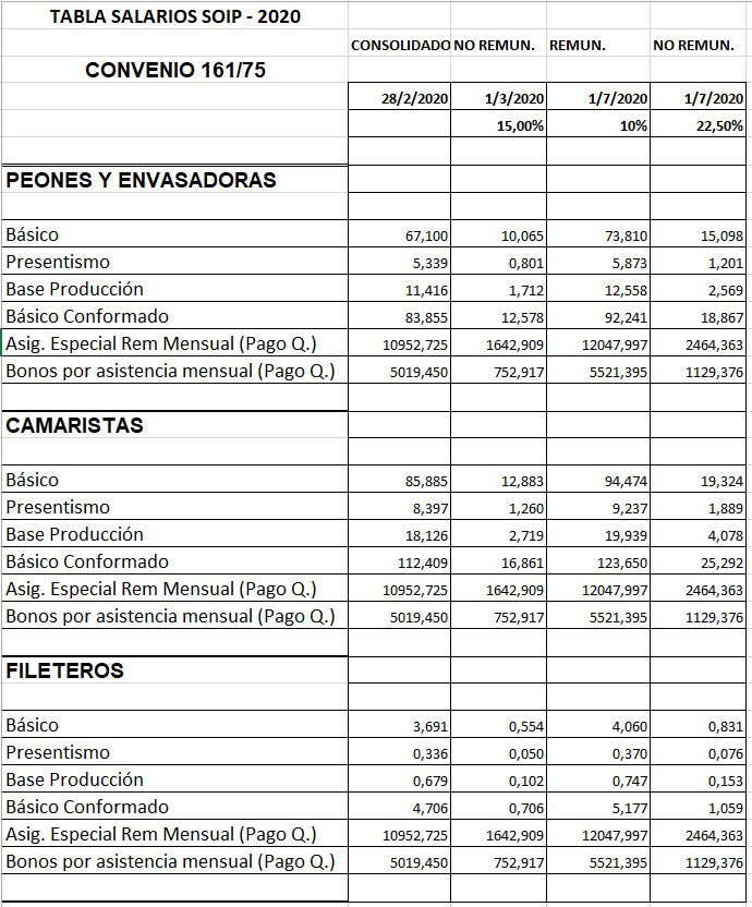 El incremento es del 32,5 por ciento. De acuerdo a lo que pudo saber Pescare.com.ar, se abona a partir de julio en el marco del Convenio Colectivo de Trabajo 161/75 que rige para fileteros, peones, envasadores y camaristas. Es un 10 por ciento remunerativo y el restante 22,5 por ciento no remunerativo.