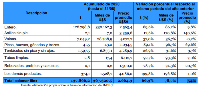 En forma global, durante este año se exportaron 138 mil toneladas de calamar a cambio de 367,3 millones de dólares. El precio promedio por tonelada estuvo en la zona de los 2.664,3 dólares, con una suba del 7,4 por ciento respecto a igual período de 2019.