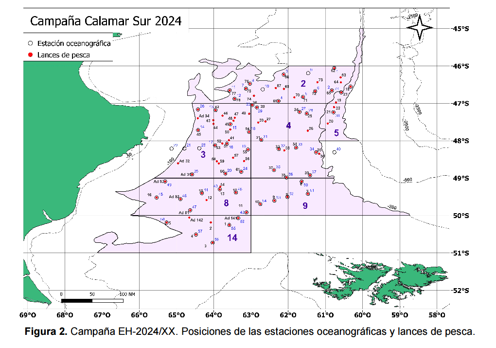 Del mismo modo se fijó un total de 87 lances y se adoptó un mínimo de 5 lances por estrato, donde se navegará hacia los estratos más sureños (14,8), en sentido opuesto a la migración de los calamares del SSP.