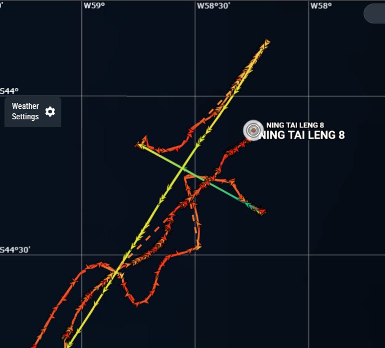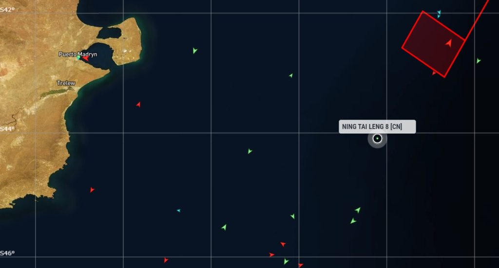 Entre ellas se destacan operando los Reefer, Procyon, Frío Poseidón (ambos con banderas panameñas, Scout (fondeado en Islas Malvinas en Bahía Agradable), y extrañamente el Ning Tai Leng 8 de bandera china, que sugestivamente se encuentra al lado del NINGTAILENG8 que bien podría ser un cambio de AIS (raro) o una duplicación de buques -gemelo- (nada extraño en aguas internacionales), -tarea que fue objetivo de Órdenes Navales del submarino ARA San Juan tristemente perdido a escasas millas de ese sector del Atlántico Sur- donde la flota china y coreana, en modalidad potera, captura el illex que desborda la plataforma continental argentina.