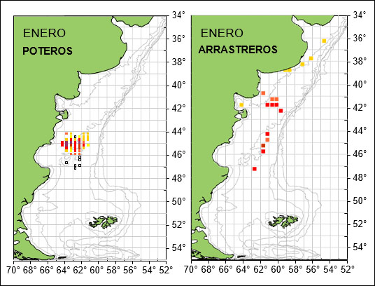 En el instituto contaban hasta la realización del informe con información correspondiente a 19 barcos arrastreros que operaron entre el 1° y 27 de enero. Obtuvieron unas 56 toneladas, cuyo 82 por ciento se pescó sobre la plataforma intermedia, entre 44°S y 46°S.