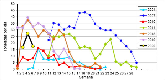 Esa flota sumó un total de 10.649 toneladas: “Entre las semanas 2 y 4 se registraron rendimientos semanales promedio de entre 17 y 27 t./día, notablemente inferiores a los observados en 2018 y 2019, que oscilaron entre 32 y 40 t./día”, subraya el texto.