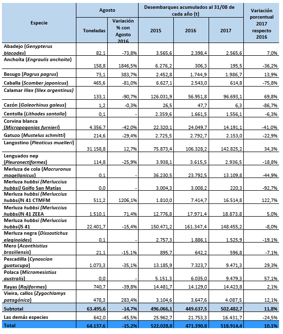 El volumen acumulado en los muelles entre enero y agosto de este año alcanzó las 518.914 toneladas. La cifra señala un crecimiento del 10,1 por ciento en relación al mismo período 2016, según datos de la Subsecretaría de Pesca de la Nación a los que accedió Pescare.com.ar.
