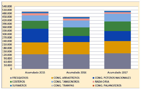 El reflejo de esta actividad tuvo a los poteros congeladores obteniendo un 60 por ciento más respecto a la floja temporada 2016. En tanto, mejora levemente la participación global de los fresqueros y congeladores arrastreros; mientras sigue cayendo el segmento de rada/ría.