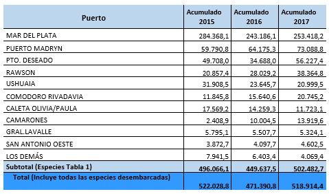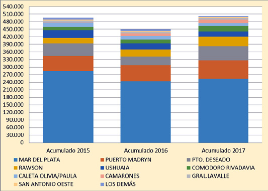 En cuanto la distribución por puertos, Mar del Plata concentró en estos ocho meses 253.418 toneladas, casi diez mil  más en relación a 2016. Se trata de un aumento del 4,2 por ciento influenciado también por la variable calamar.