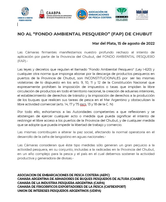 Asimismo, en un comunicado conjunto de la ASOCIACION DE EMBARCACIONES DE PESCA COSTERA Y FRESQUEROS DE ALTURA (AEPCYF), la CAMARA ARGENTINA DE ARMADORES DE BUQUES PESQUEROS DE ALTURA (CAABPA), la CAMARA DE LA INDUSTRIA PESQUERA ARGENTINA (CAIPA), la CAMARA DE FRIGORIFICOS EXPORTADORES DE LA PESCA (CAFREXPORT) y la UNION DE INTERESES PESQUEROS ARGENTINOS (UDIPA) expresaron su profundo rechazo al intento de aplicación por parte de la provincia de Chubut, al FONDO AMBIENTAL PESQUERO (FAP)