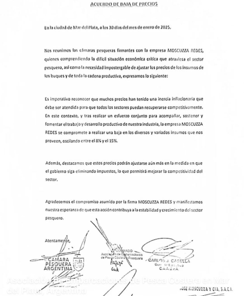 Ante la inacción del Gobierno nacional y en un esfuerzo por recuperar la rentabilidad del sector, algunas de las cámaras empresarias que componen la industria pesquera firmaron un acuerdo con la empresa Moscuzza Redes para obtener descuentos de hasta un 15% en todos sus insumos.