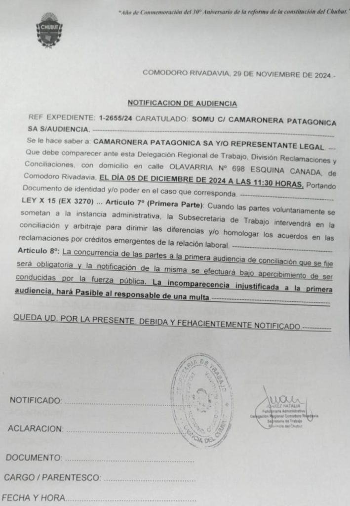 Camaronera Patagónica SA ha solicitado a la Secretaría del Trabajo de la Provincia de Chubut, Delegación Comodoro Rivadavia, la reprogramación de una nueva audiencia con el SOMU, tras la suspensión de la misma el pasado 2 de diciembre, a fin de continuar con las negociaciones paritarias relacionadas con la tripulación de los barcos fresqueros de altura que operan en el Golfo San Jorge.